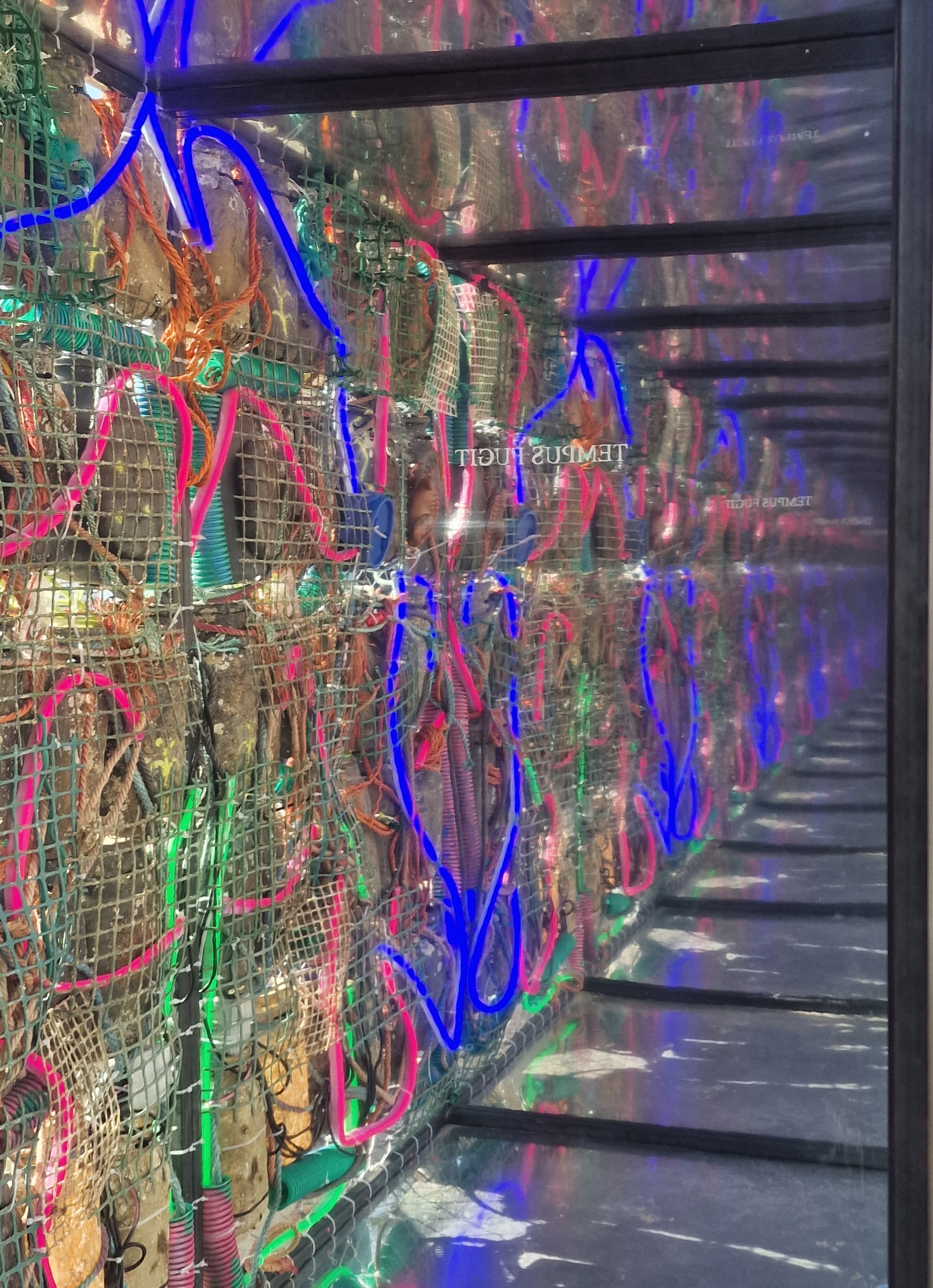 Espelhos estrategicamente dispostos criam um efeito visual infinito, multiplicando o lixo e simbolizando a dimensão alarmante da poluição marinha. O contraste entre exterior e interior revela a distância entre aparência e realidade — entre o mar idealizado e a degradação real.