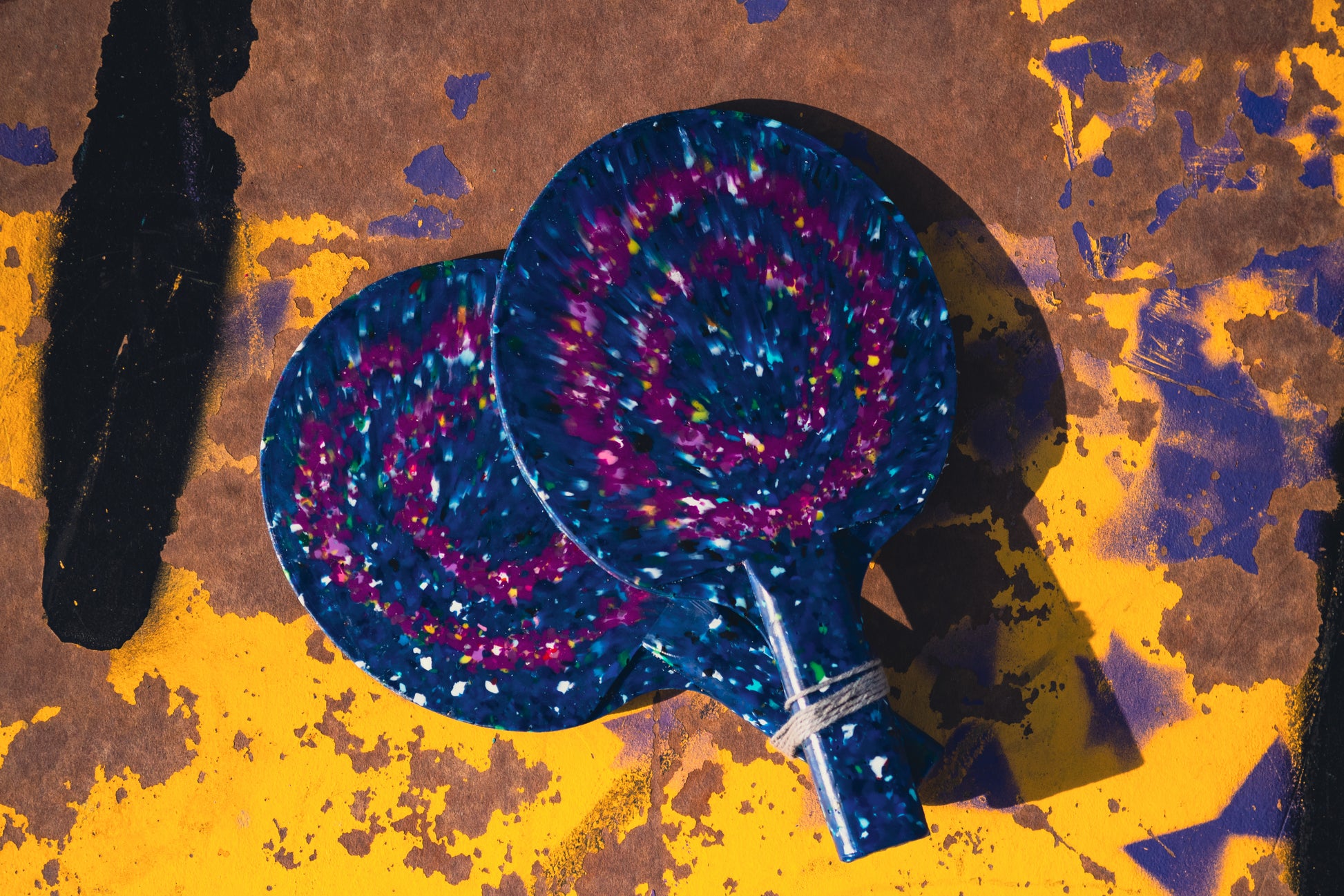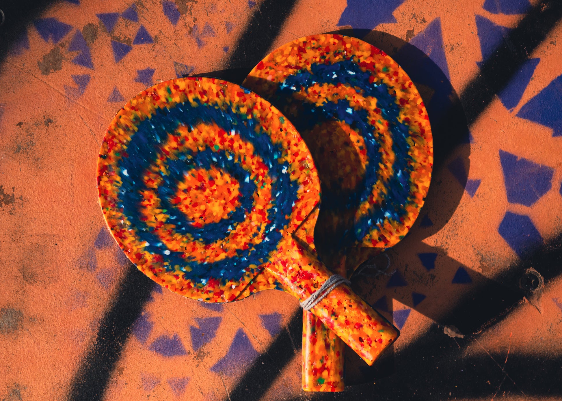 Feitas 100% de plástico reciclado, cada raquete é moldada e "colorida" à mão — o que as torna únicas. Leves, resistentes e cheias de personalidade, trazem um toque divertido a qualquer jogo.
